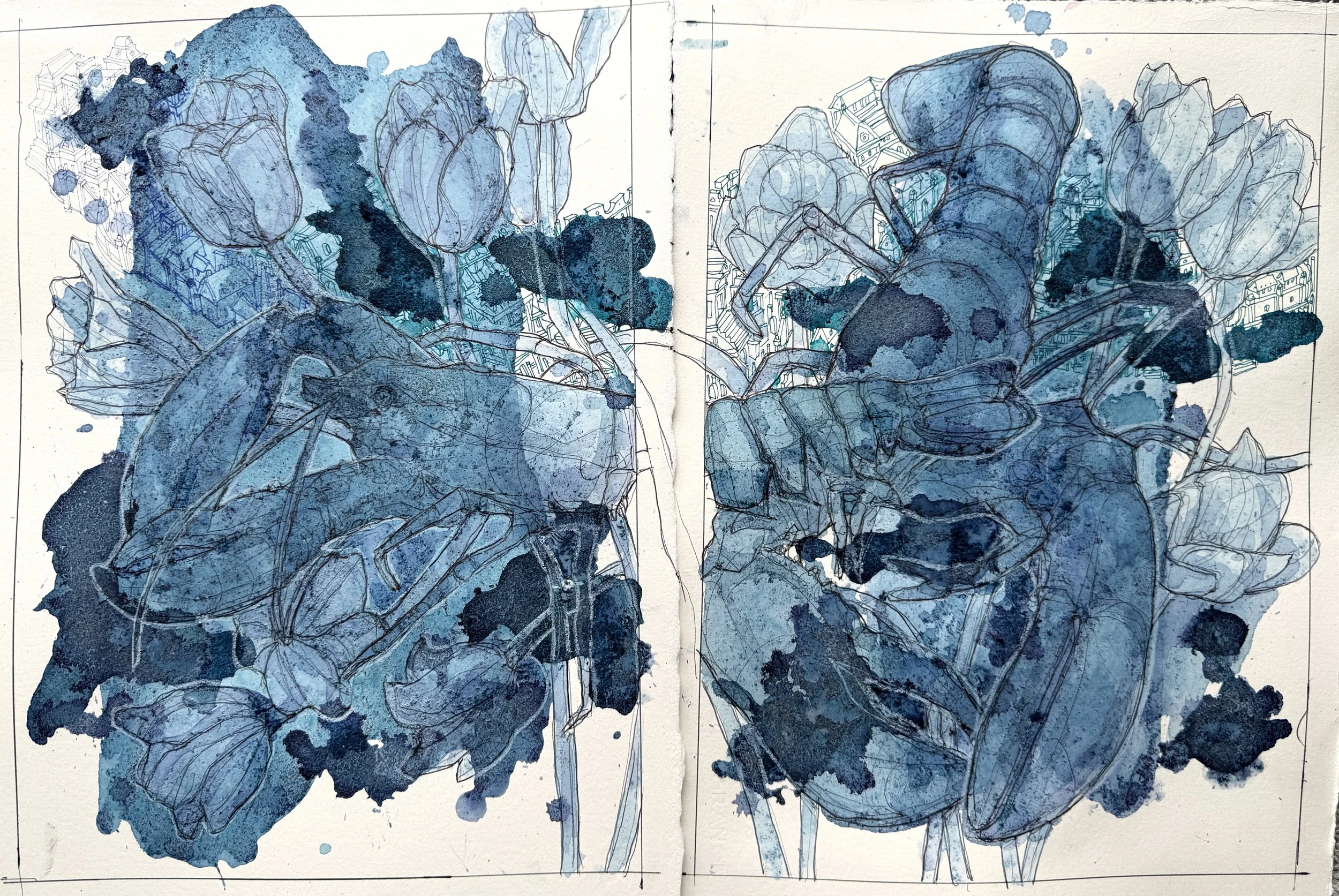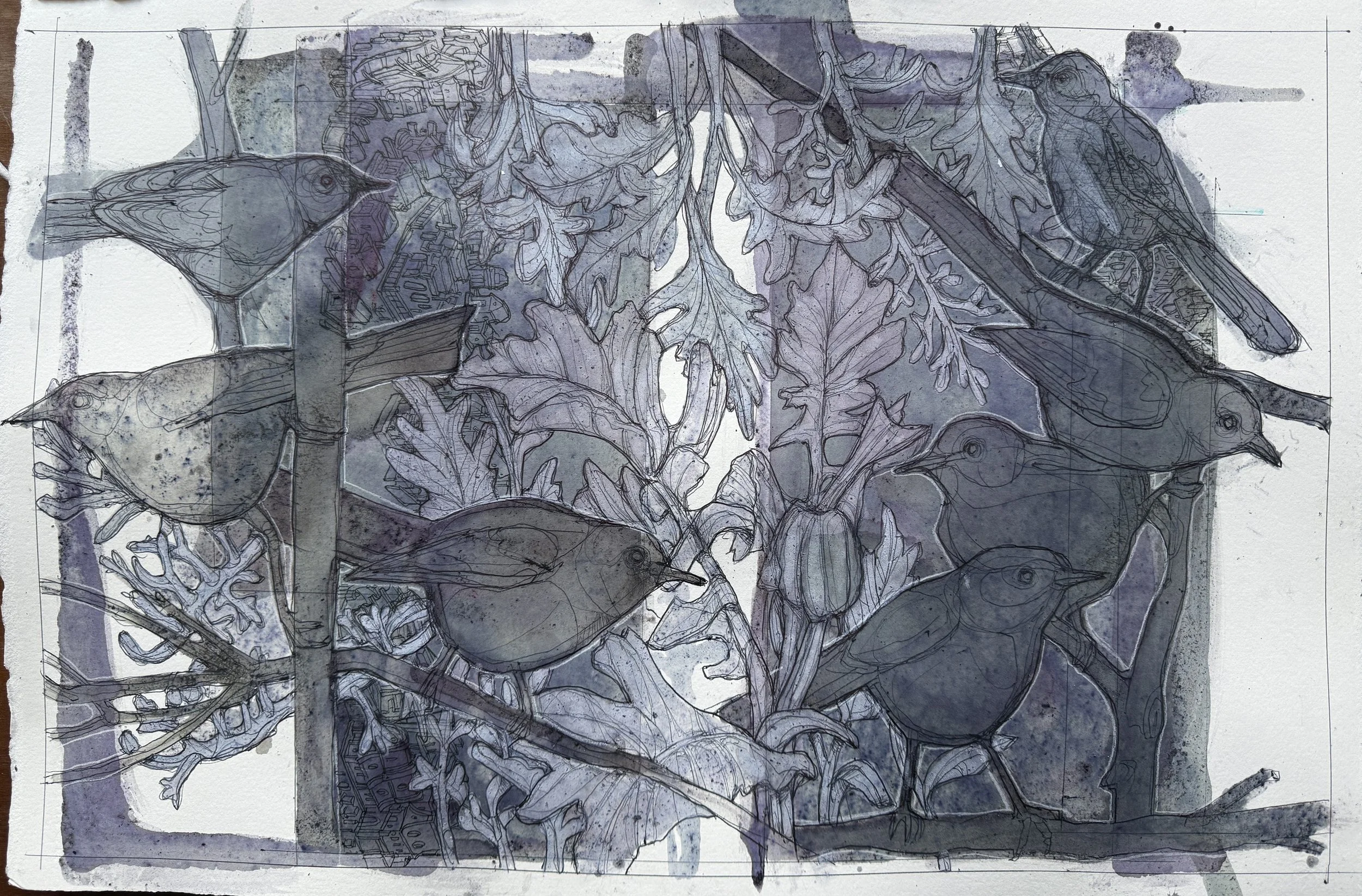 22” x 15.5” (liquefied blueberries, acrylic, pencil, ballpoint pen on Arches paper)