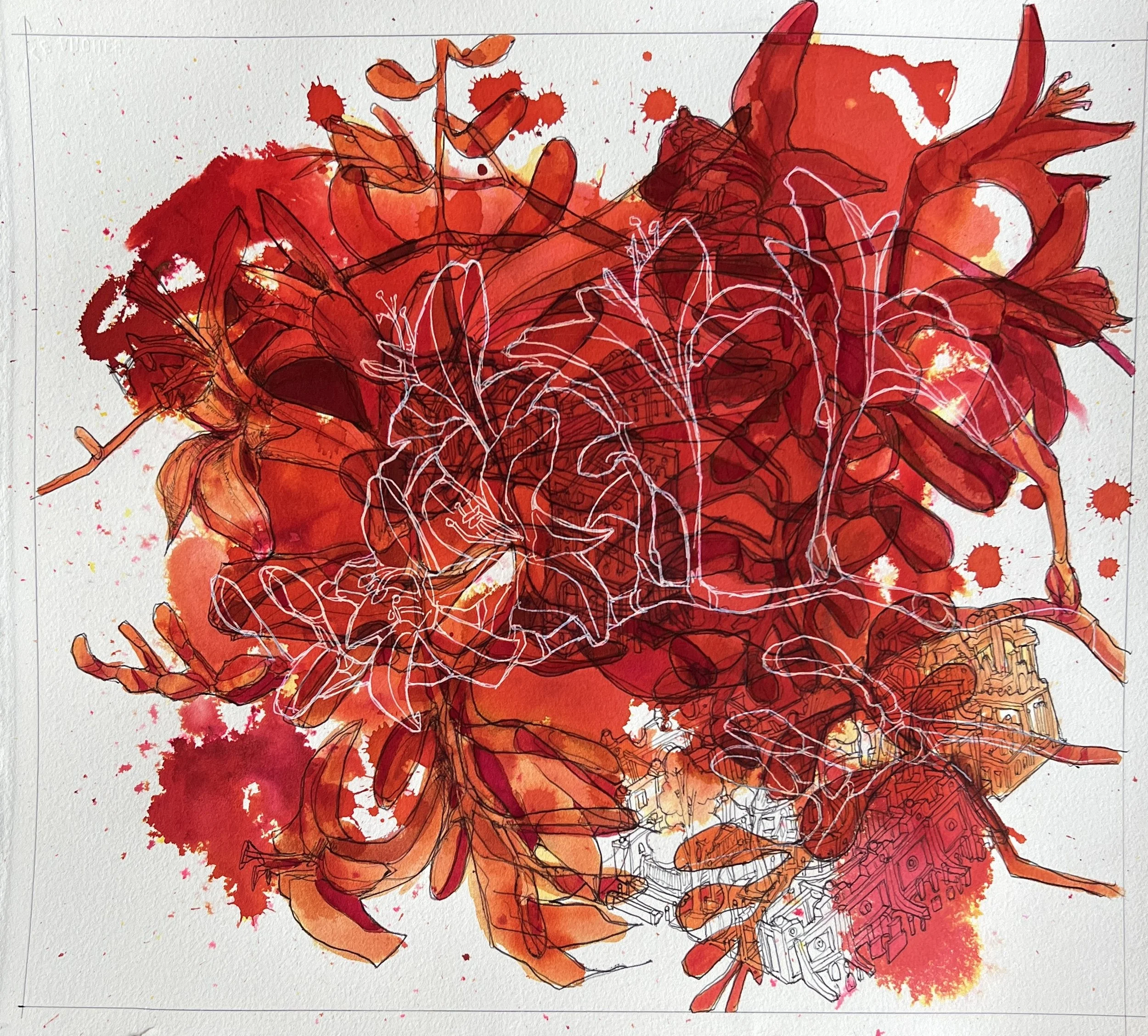 Crocosmia 16.5” x 15” (mixed media on Arches paper)