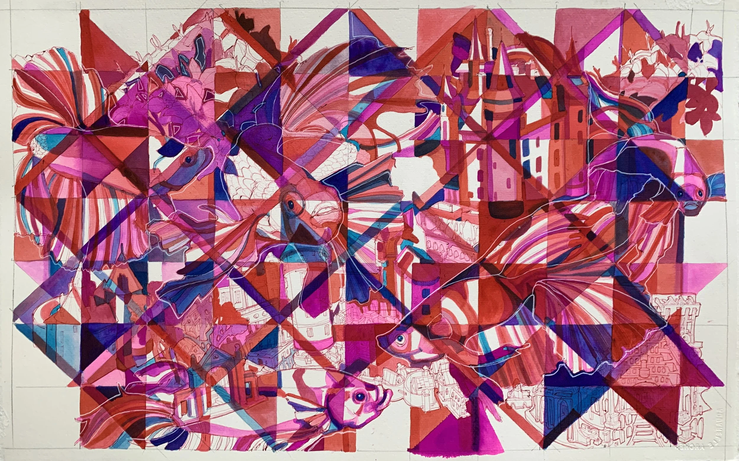 Betta Fish 22.5” x 15” (mixed media on Arches paper)