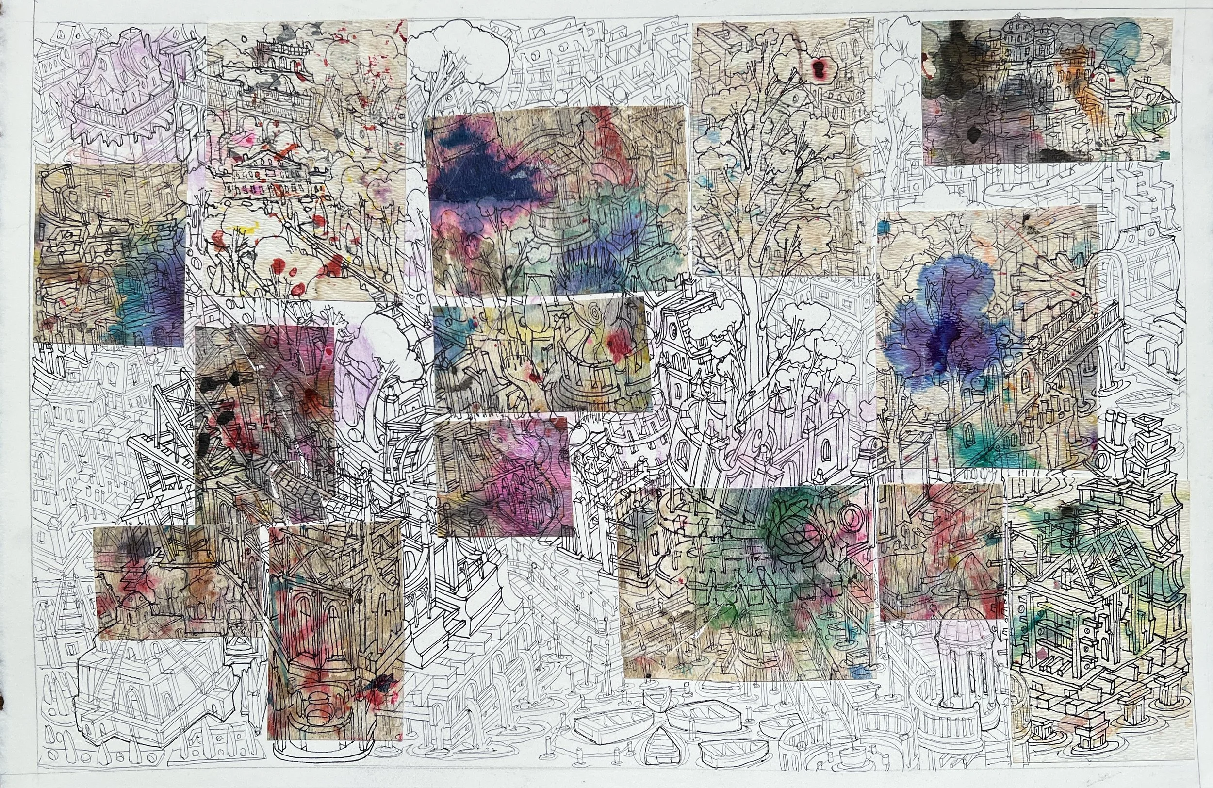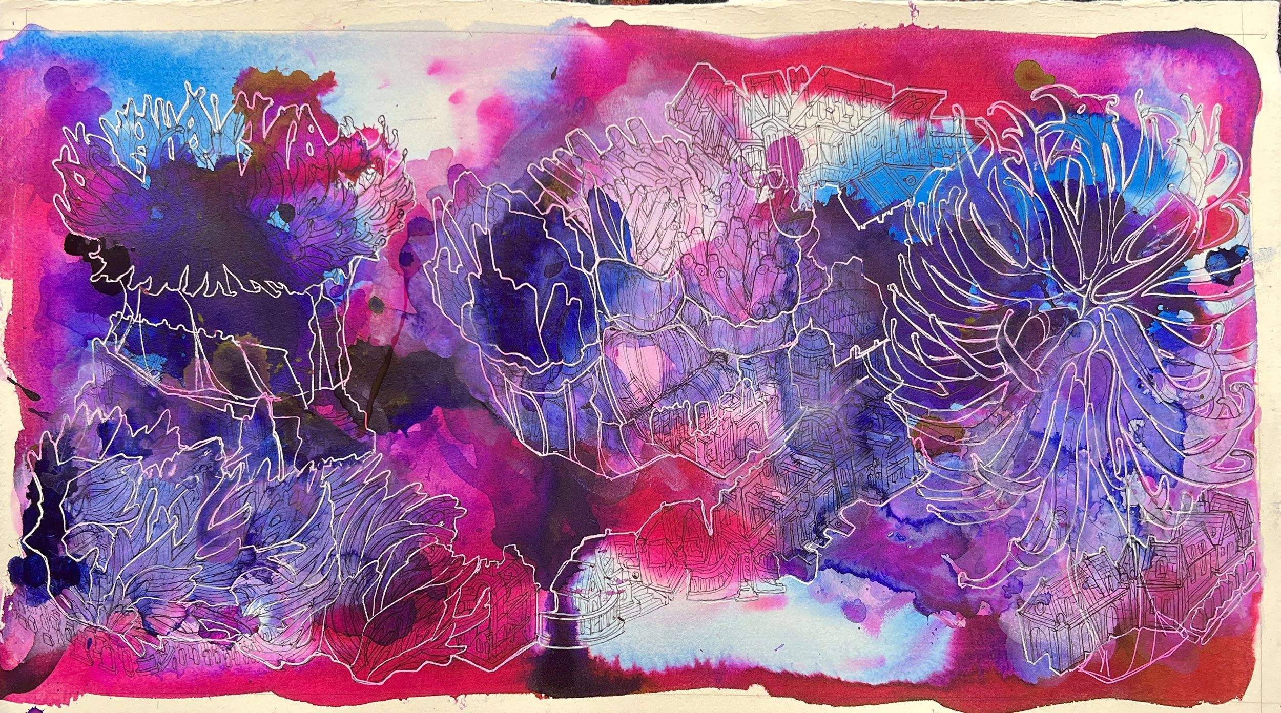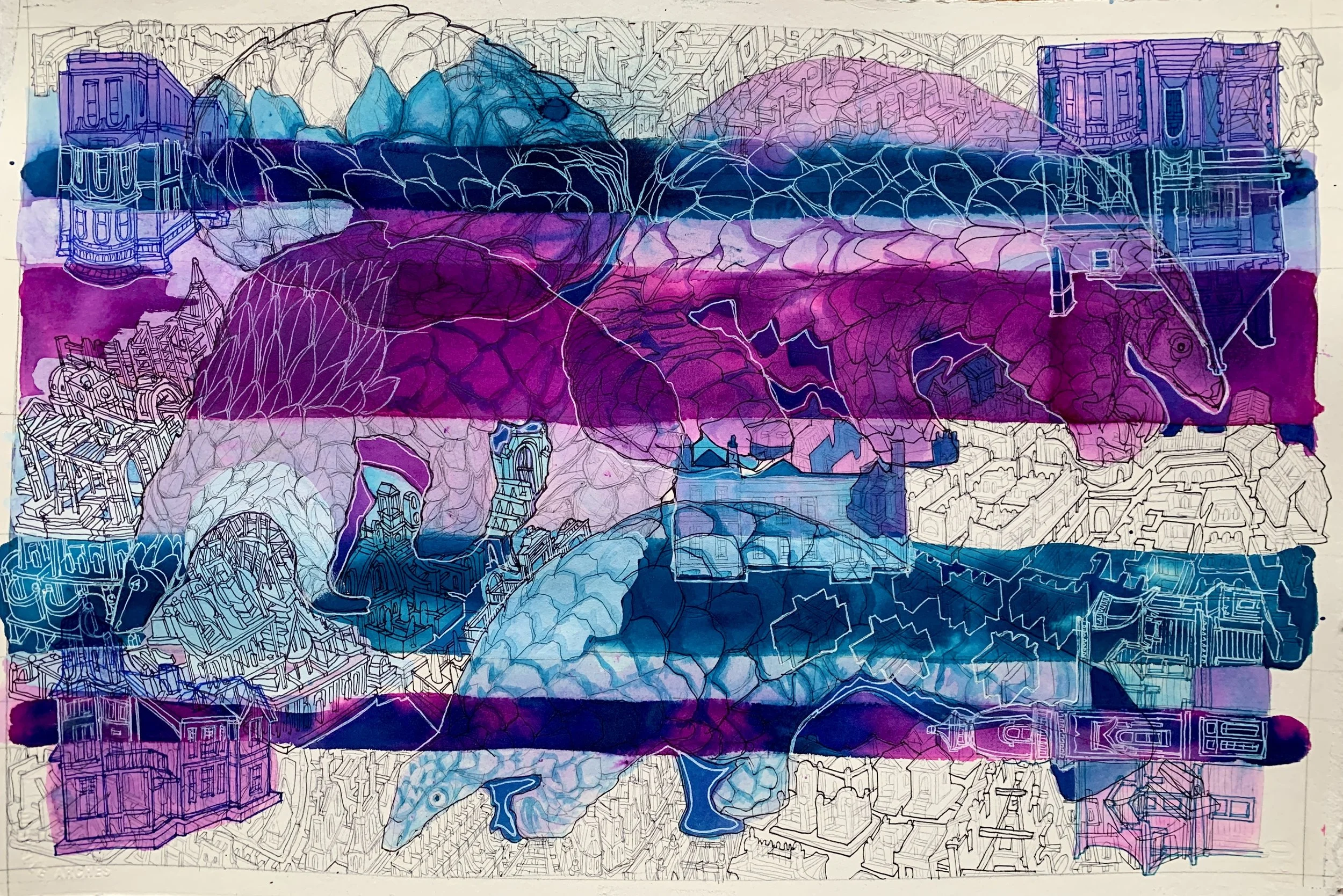 Satellites 32” x 20” (ink, liquid watercolor, acrylic on matte board)
