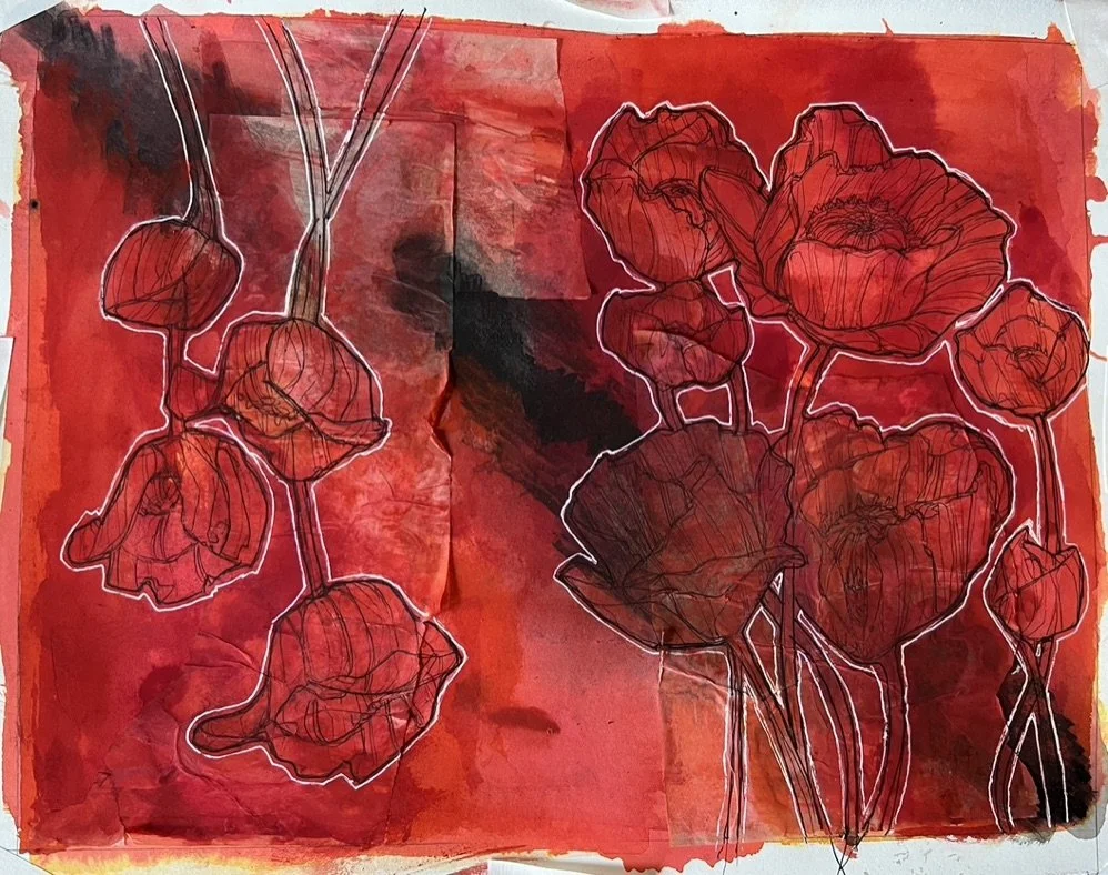 Poppies 14.5” x 11” (mixed media on Arches paper)