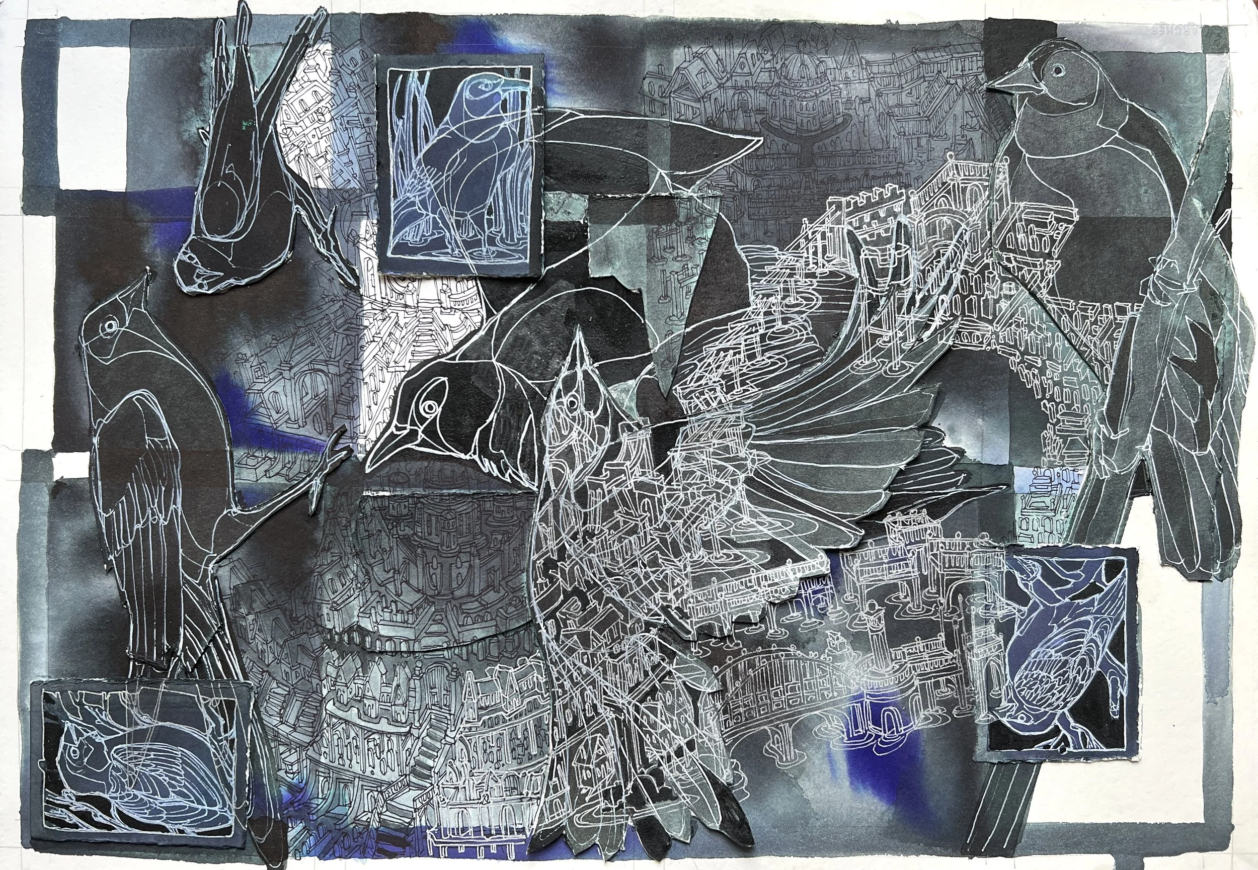 Blackbirds 22.5” x 15” (mixed media on Arches paper)