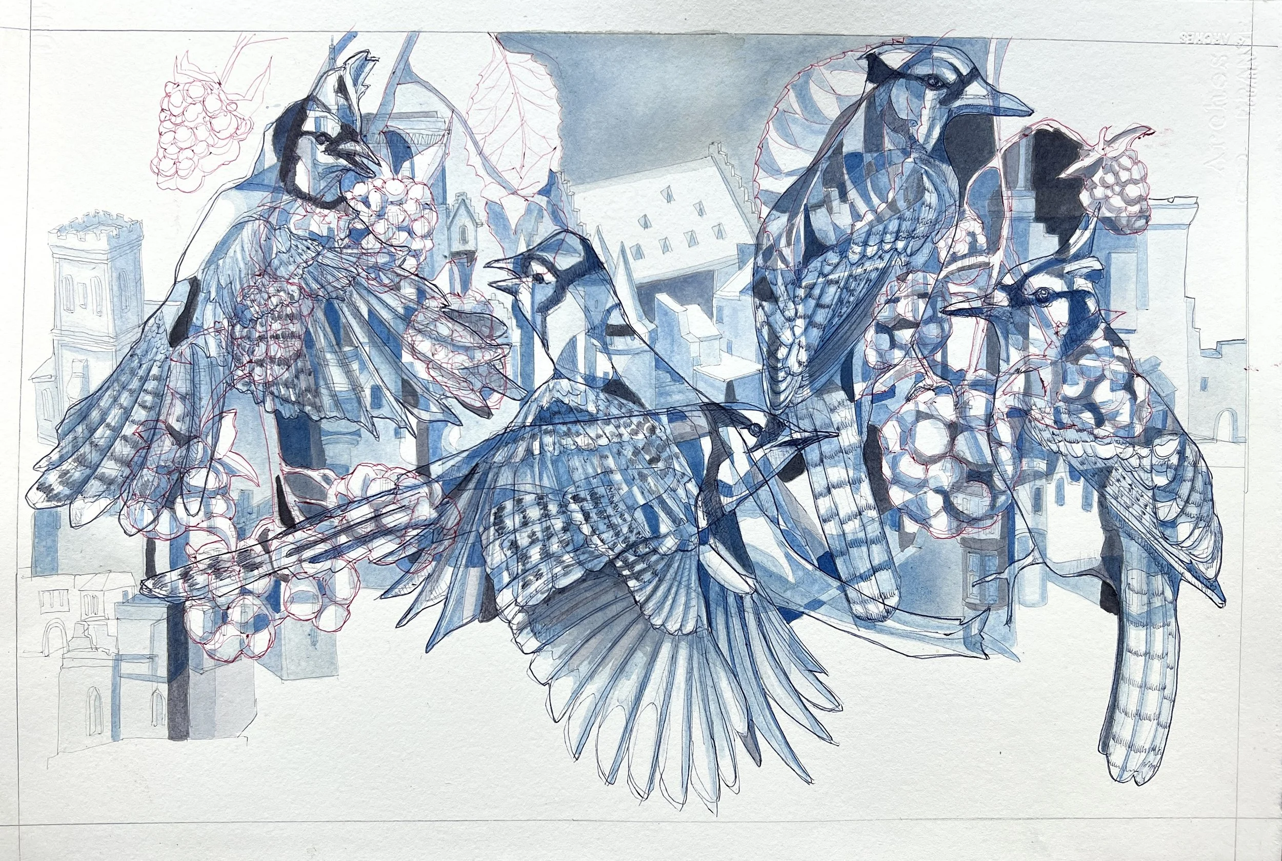 Blue Jays 22.5” x 15” (mixed media on Arches paper)