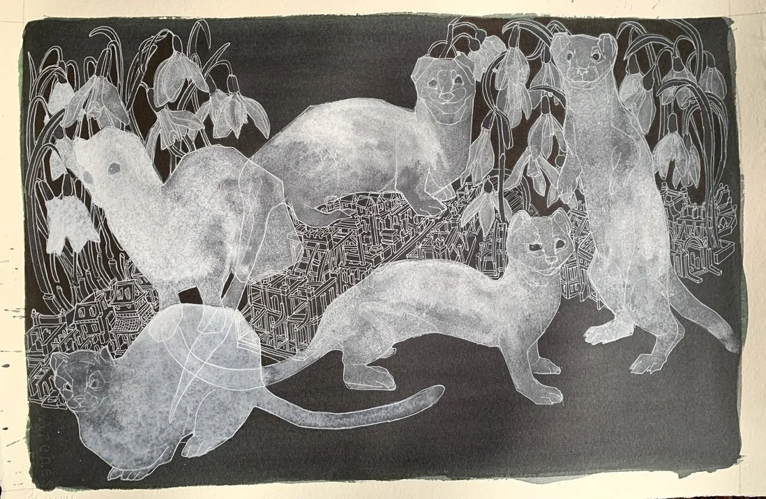Snowdrops and Stoats 23” x 15.5” (mixed media on Arches paper)