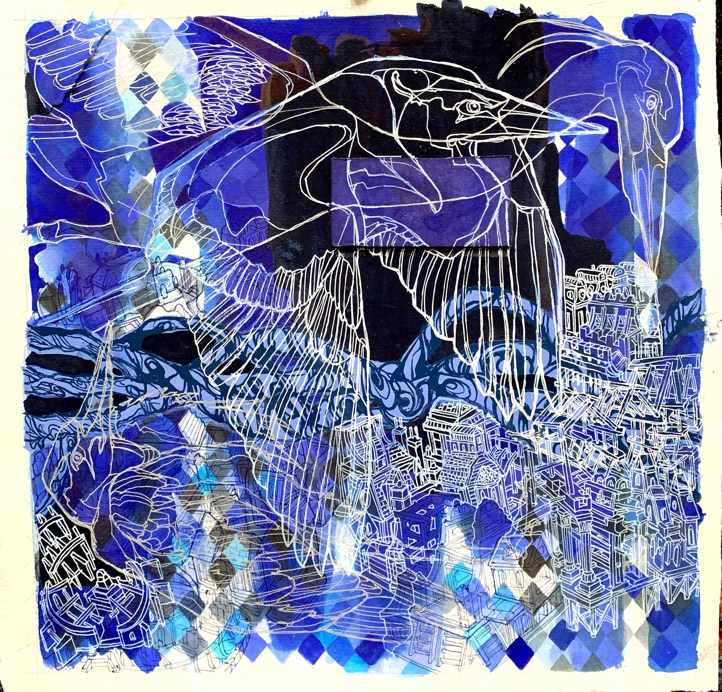 Blue Herons 16.5” x 15” (ink, acrylic, metallic paint, watercolor on Arches paper)